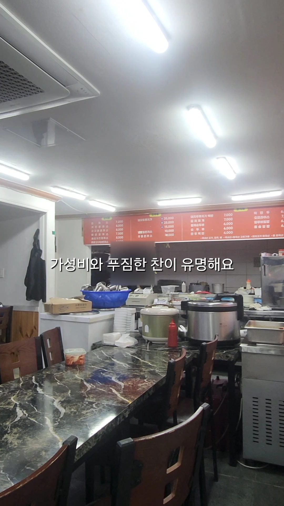 - 주요 메뉴 : 돈까스 7,000원, 돼지두루치기백반 7,000원, 순두부찌개·비빔국수 등. 서비스 반찬(어묵볶음·깻잎·단무지·콩나물) 풍성.