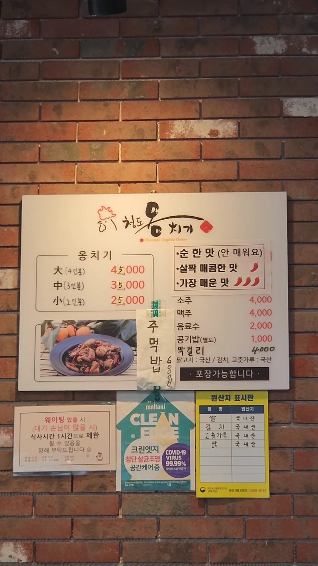 - 주요 메뉴 : 옹치기(소 25,000원~대 40,000원, 맵기 3단계 조절), 콩나물국·김치 무한 리필. 밥·치킨무 서비스.